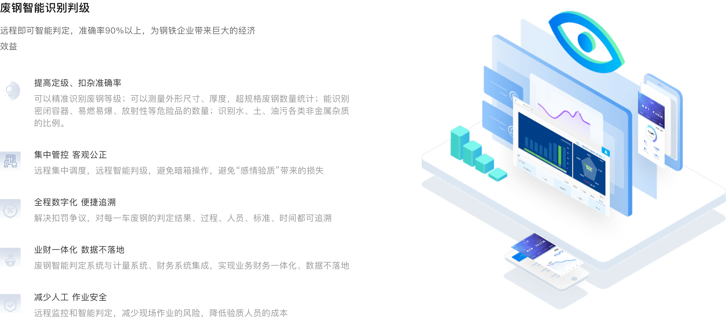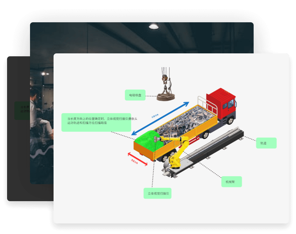 废钢智能识别系统软硬技术结合的智能产品。我们运用立体视觉检测技术、智能机器人、人工智能图像识别技术,分别对废钢厚度、扣罚项目、物质成分进行识别检测,并精确统计厚度、杂质、扣罚项目占比。结合互联网技术、物联网技术、智能机器人技术将废钢进场、废钢称重、废钢定级等环节无缝智能串联起来,构建一个全自动智能识别系统,最终实现废钢自动判级、扣重、扣杂、结算。