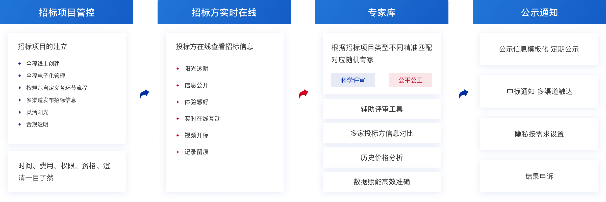 实现招投标全流程管控功能;支持多种招标类型,并根据招标类型配置招标模板,可维护需求部门、招标部门、代理部门等招标机构信息;关键节点自动预警,供应商风险监测自动推测,预防企业被围标造成利益损失